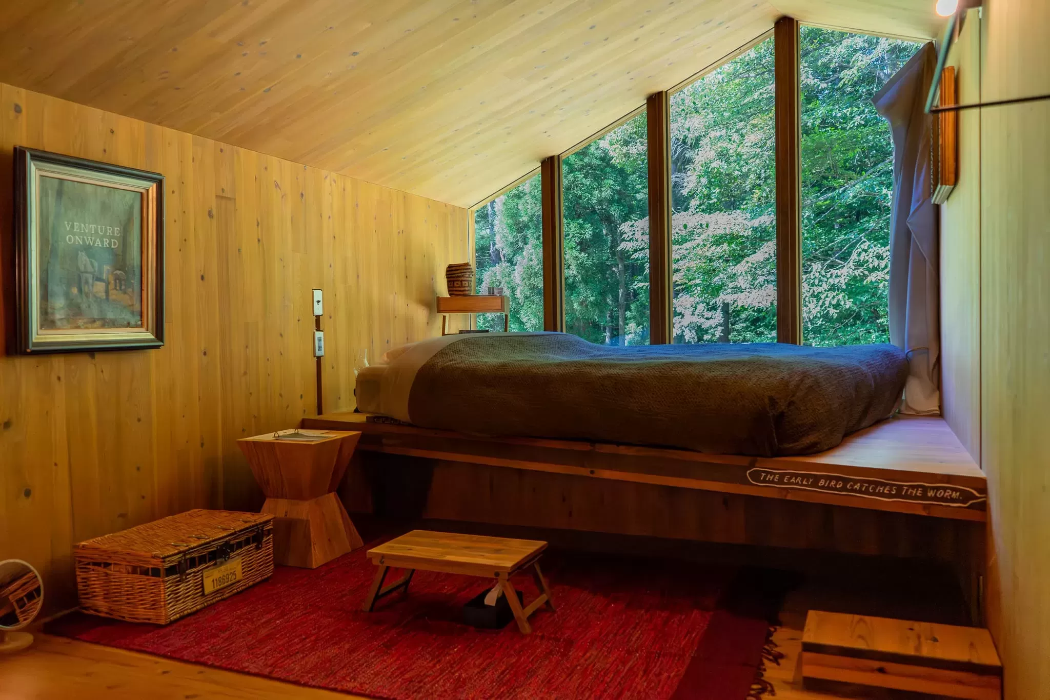 This room offers views of the trees from the bedroom(Guest Cabin 008). The outdoor bathtub can be used not only as a cold plunge for the sauna, but also filled with warm water for bathing.