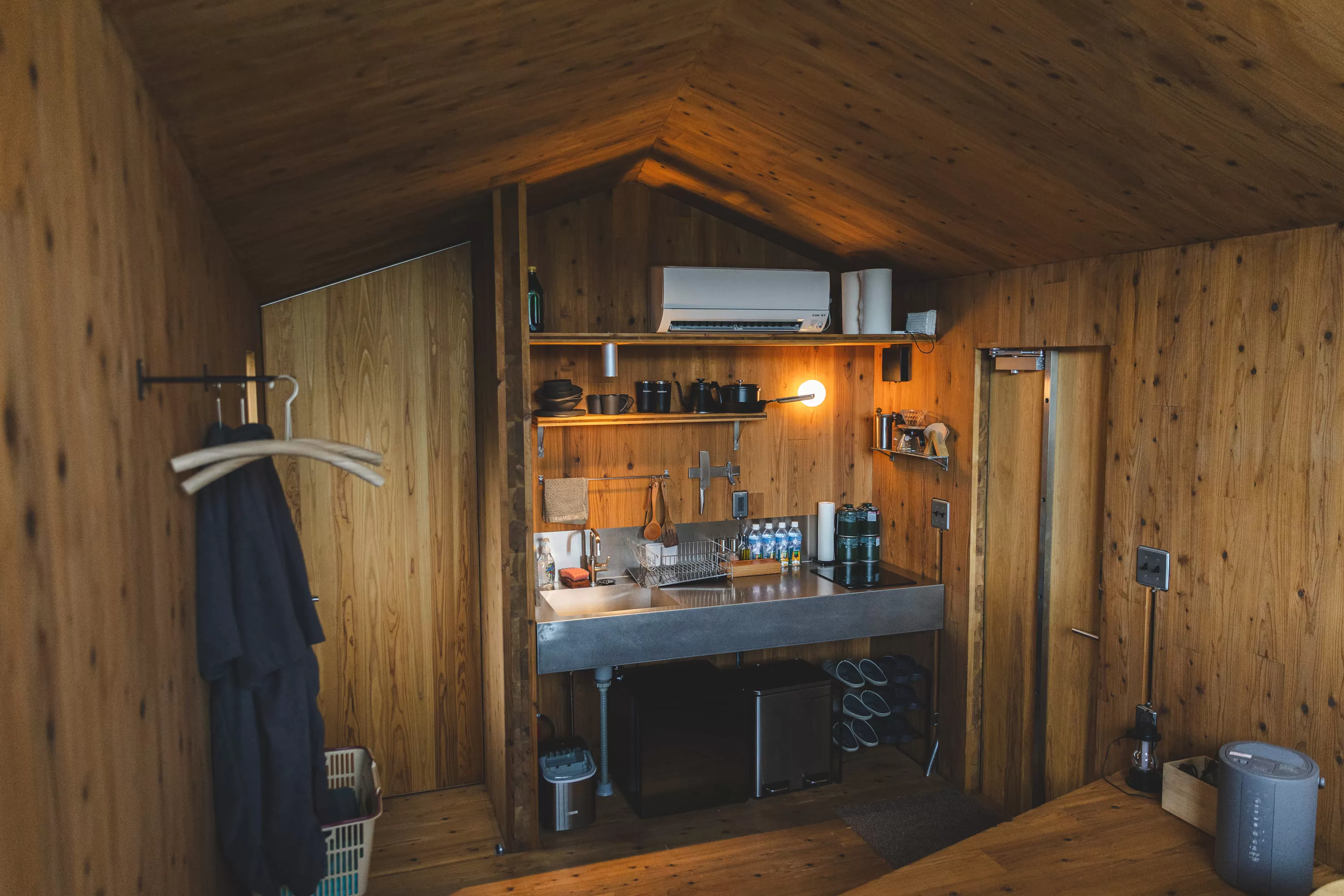Queen bed x 1, extra futon (single futon x 2), sink, shower, toilet, sauna, BBQ grill, campfire, air conditioner, humidifier, induction stove, refrigerator, ice maker, outdoor table, outdoor chair, infinity chair