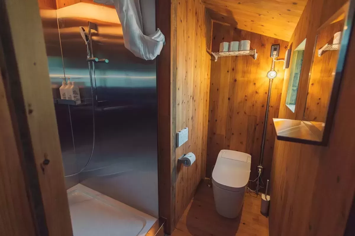 Queen Bed x1, Extra Bedding (2 Single Futons), Sink, Shower, Toilet, Sauna, BBQ Stove, Air Conditioner, Humidifier, IH Stove, Refrigerator, Ice Maker, Outdoor Table, Outdoor Chairs, Infinity Chair